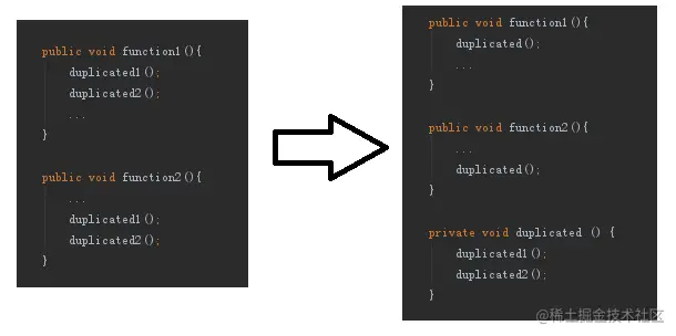 function1()和function2()中有一段代码是一模一样的,所以我们可以把那一段代码提炼成一个函数duplicated(),然后只要调用这个函数就可以了。