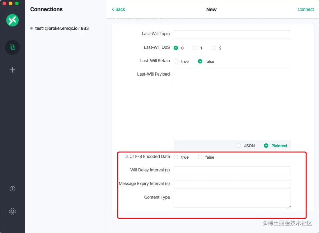 新版本还对 MQTT 5.0 中的一些功能特性进行了支持。创建连接时,选择 MQTT 的版本为 5.0,便可以对遗嘱消息中的