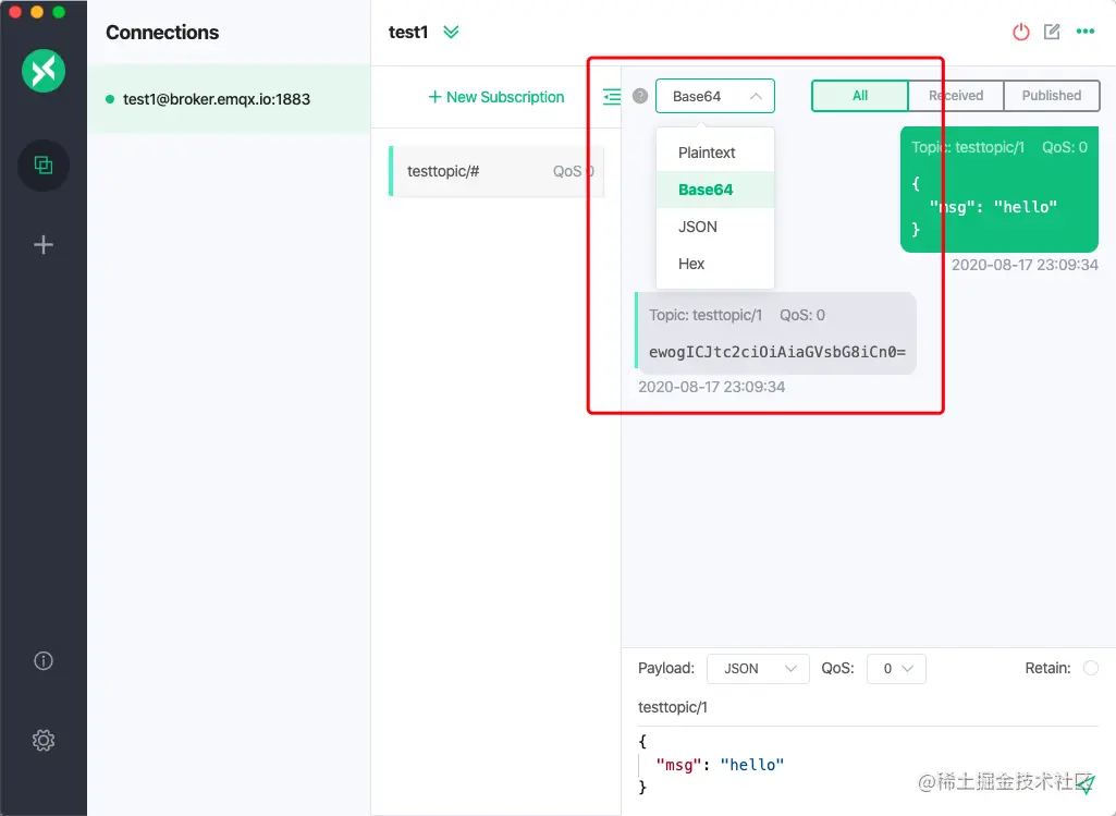 Base64,Hex,Plaintext和JSON的编码格式。在该版本中对该功能进行了扩展,同时支持了对接收消息进行编码格式的转化,用户可以根据自己需求实现在发送端和接受端进行不同的消息格式编码转化。