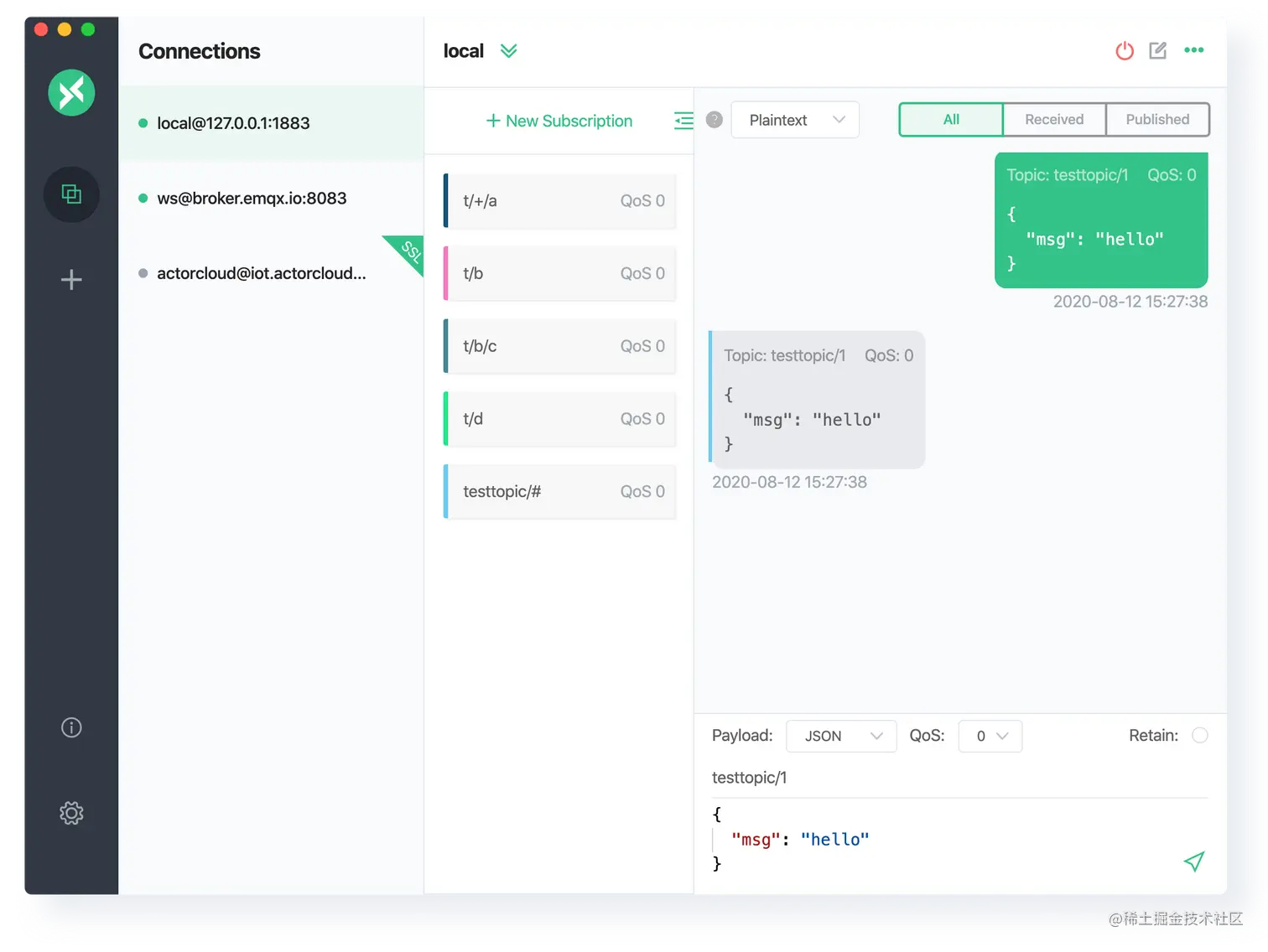 在 MQTT X 中添加订阅 Topic 时,可以选择对应颜色,对 Topic 进行区分。在该版本中还新增了当接收到订阅过的 Topic 消息时,消息框左侧会有和已订阅 Topic 一样的颜色标记,这样可以在接收到很多不同的 Topic 消息时,在视图中清晰明了的分辨出这些消息来源于哪个 Topic。