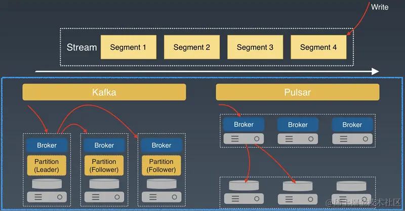 对于 Write 这种模式,所有的写都直接追加在 Stream 的尾部。对于和 Kafka 类似的 Master/Slave 架构系统来说,数据会先写入 Leader Broker,再发送给其他 Follower Broker。