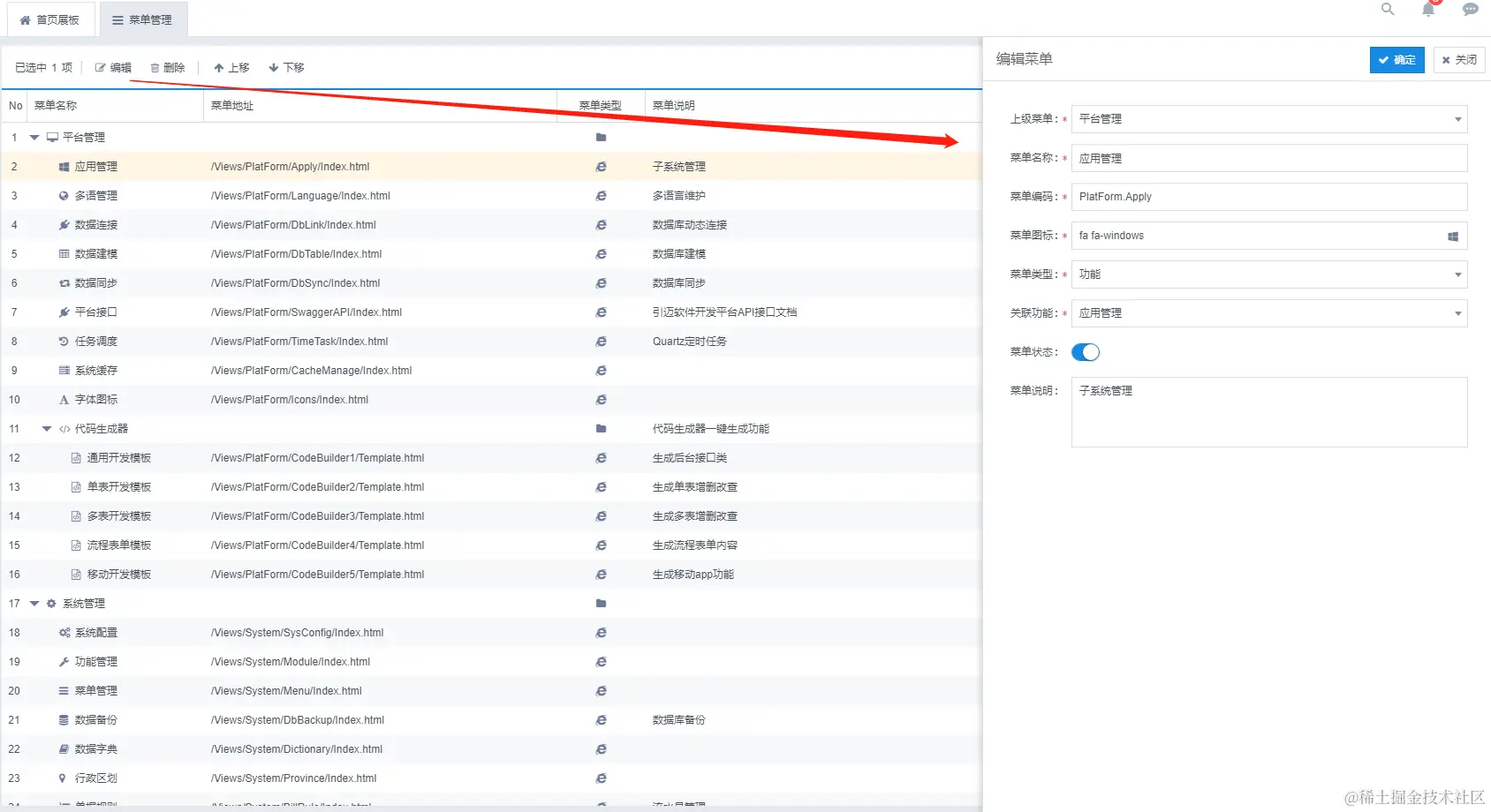 步骤2:在右侧修改框中可以对上级菜单,菜单名称,编码,图标等进行修改,还能添加说明,把遇到的需求问题清楚写入进去,以备后期查阅。