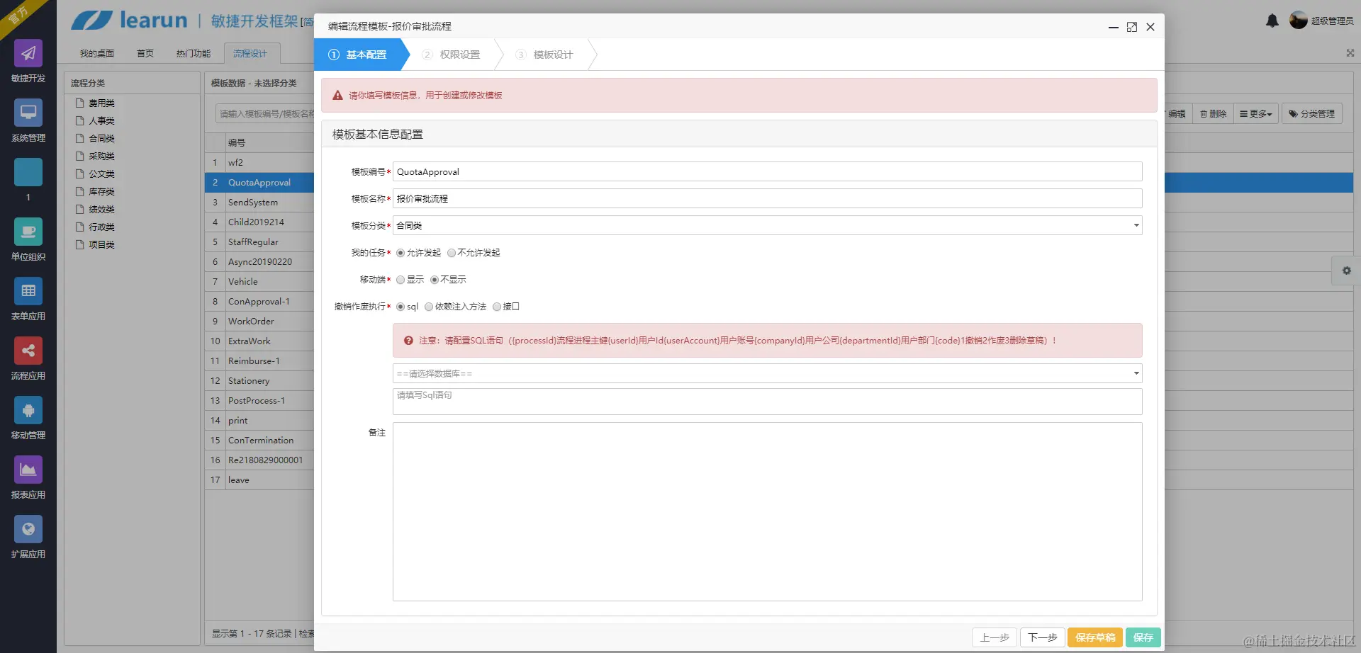 实现企业信息审批流程化。基于企业的实际需求,近几年出现了一批标准的企业级工作流引擎,并获得了双软认证。这里讲一下口碑比较好的Learun,总体采用拖拽式设计,配合代码生成器,通用业务流程代码量接近于零,各项指标及客户反映都不错,其基本思路如下: