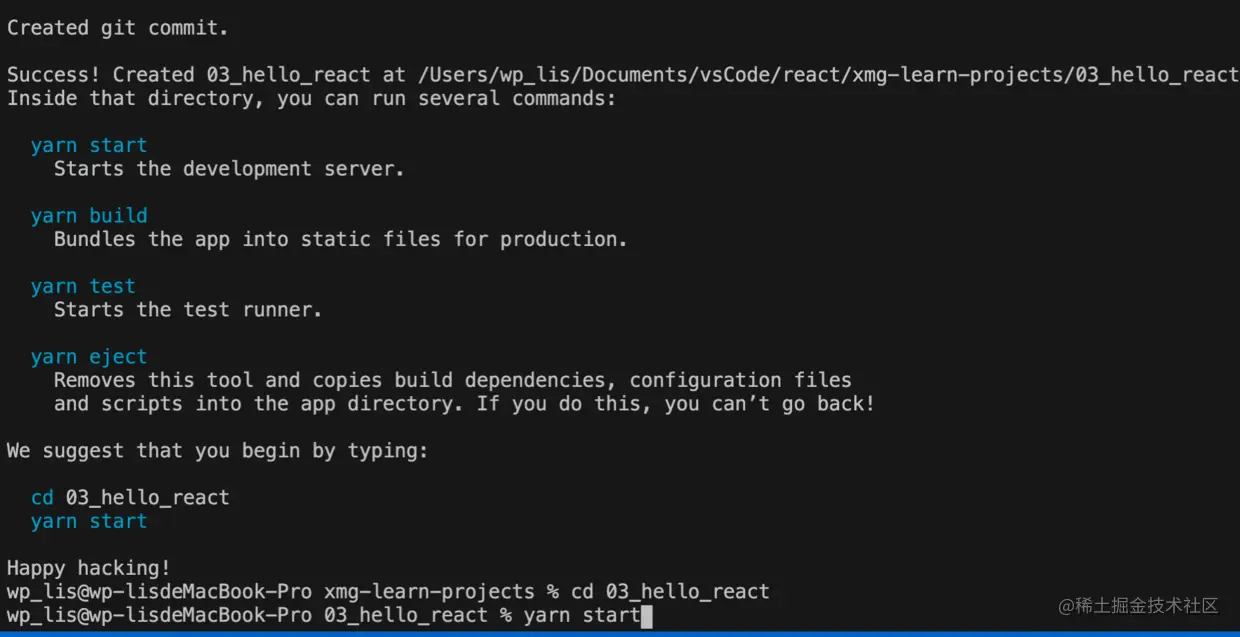 然后进入my-project目录下: cd my-project, 再执行yarn start命令。