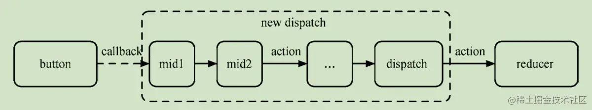 中间件就是一个函数,对store.dispatch方法进行了改造,在发出 Action 和执行 Reducer 这两步之间,添加了其他功能。如下图:
