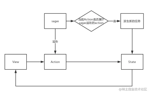 redux-saga相当于在Redux原有数据流中多了一层,通过对Action进行监听,从而捕获到监听的Action,然后可以派生一个新的任务对state进行维护