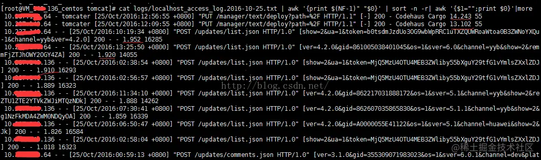 cat logs/localhost_access_log.2016-10-25.txt | awk '{print 0}'| sort -n -r| awk'{ 0}' 按照倒数第二列由大到小显示接口以及访问时间。这样我们就能找出那些借口耗时较大,然后对其进行优化,提高用户体验。