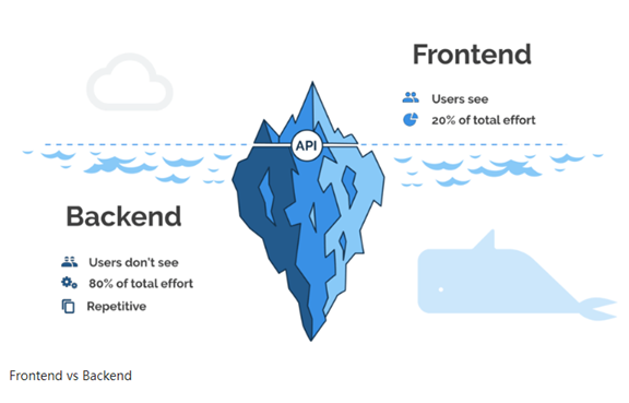 首先,我们来简单了解下前后端的工作在软件开发中的关系。前端的大部分工作其实是网站、app或者小程序上看到的页面展示或图形化的展示,用户使用这些前端界面完成使用操作。而后端是实现业务逻辑,操作数据的部分,前后端通过API完成相互的调用。