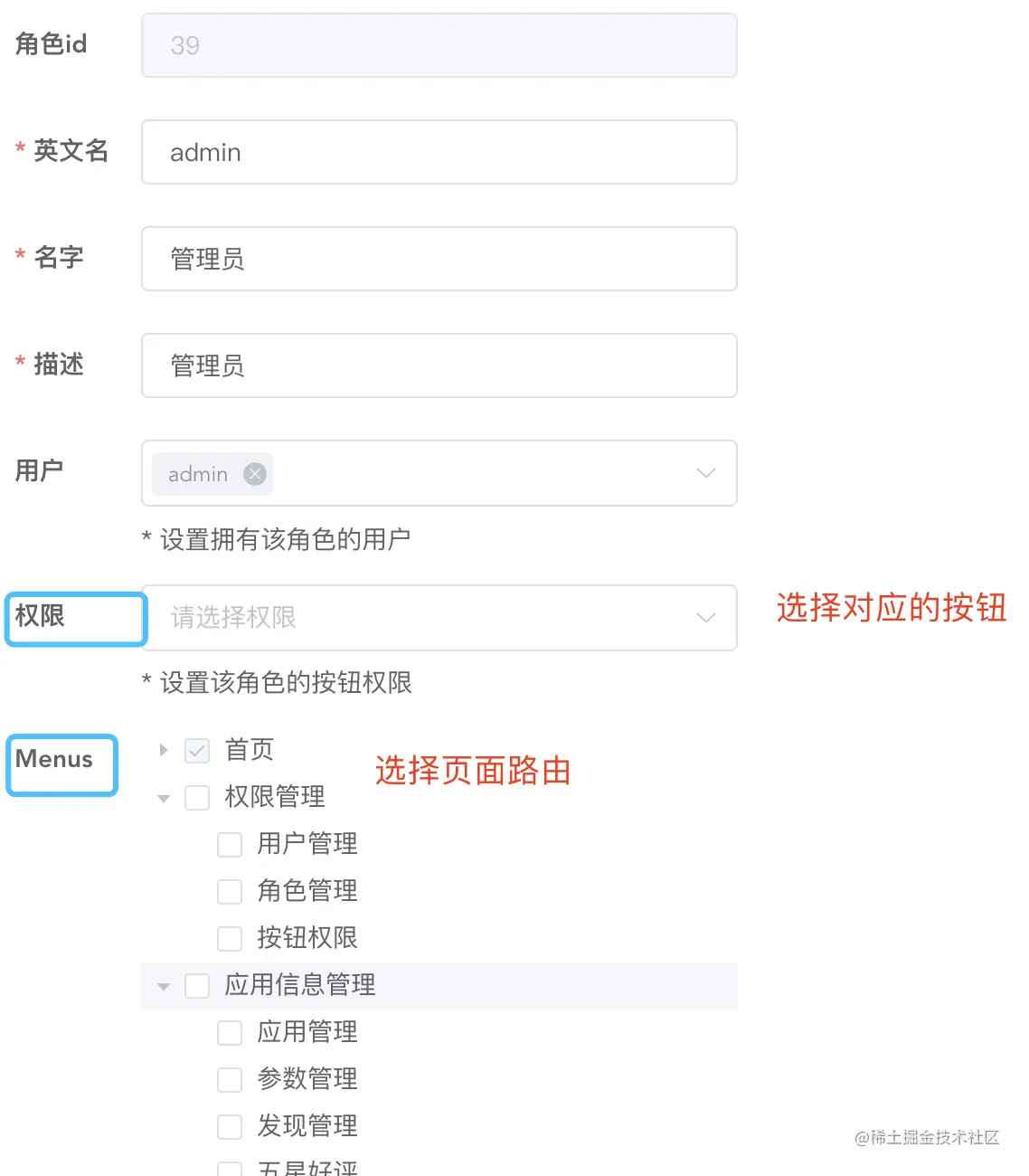 - 再设置角色,角色里配置对应的路由和按钮