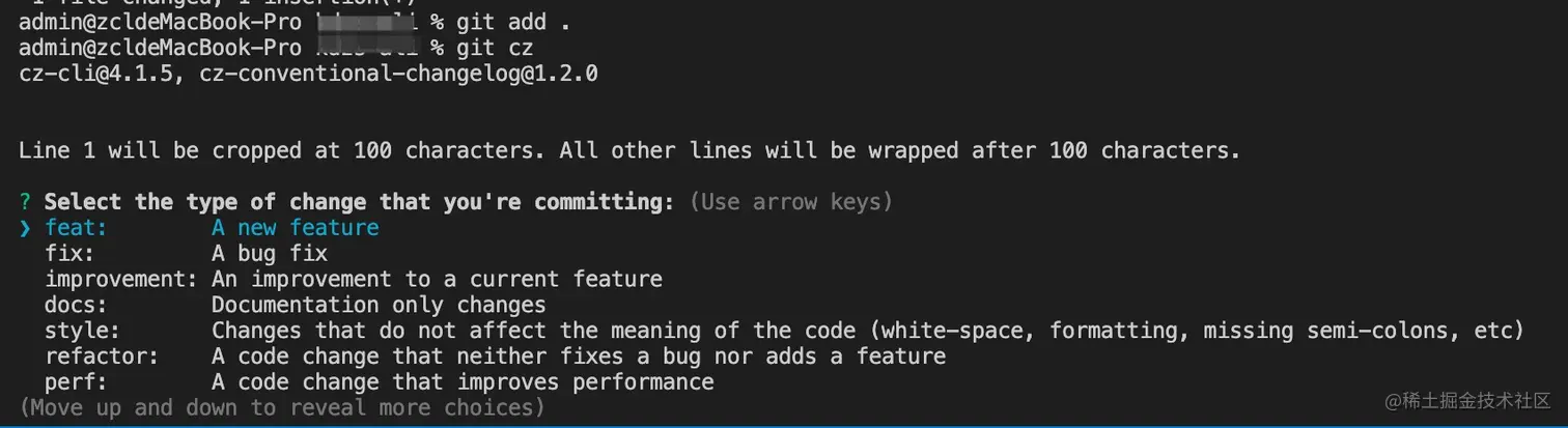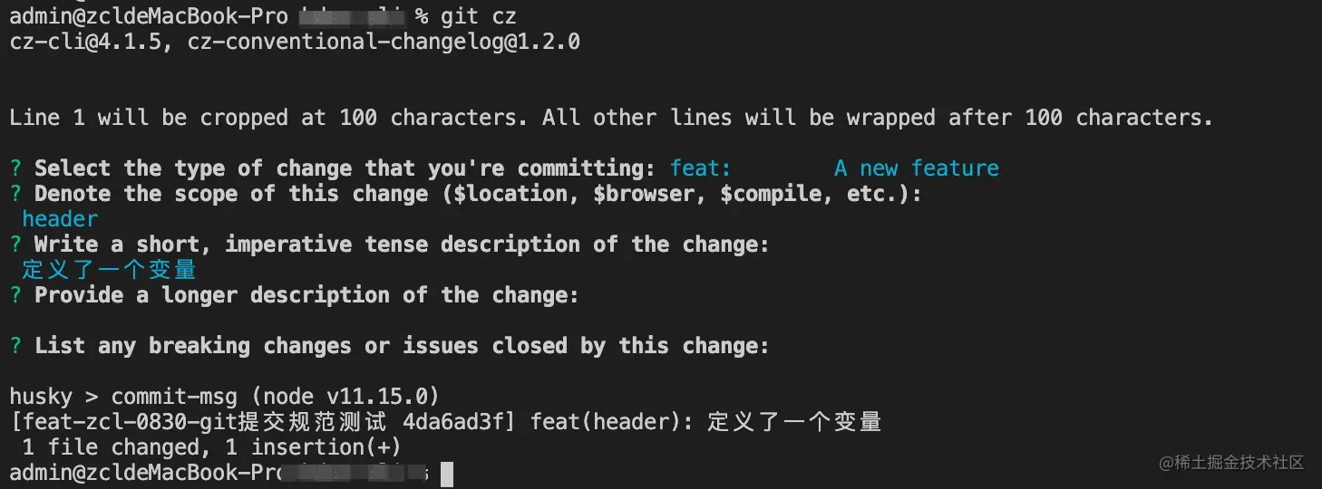 安装了cz-conventional-changelog 可以自动为你生成符合规范的commit信息, 安装完用cz-conventional-changelog包,就可以用git cz来替换git commit,使用git cz会以交互的形式来让你输入正确格式的commit提交信息