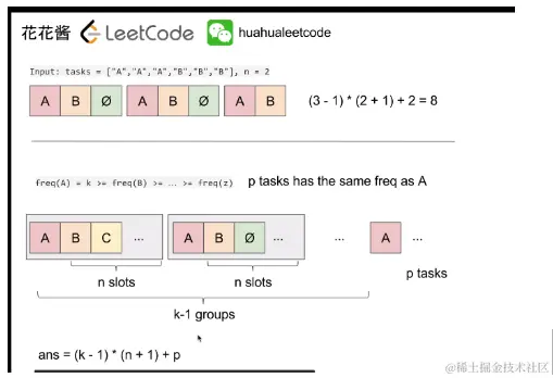 当然有可能出现最高频率A出现的次数很少,此时的task的长度会大于这个公式计算出来的长度,有足够多的task长度时,可以规划完!这时取一个最大值 task长度和公式计算出来的长度 即可