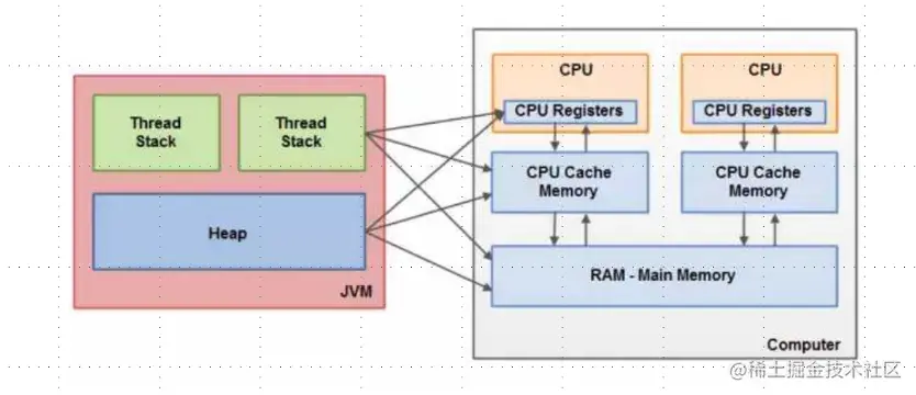 如下图所示,线程在栈中,一般新建的本地变量都在堆中。每一个在栈中的线程获得的都是堆中的变量、方法的拷贝。