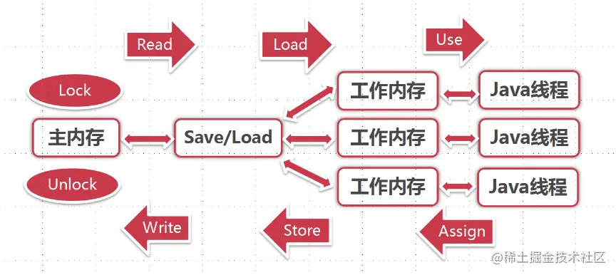 一个新的变量只能在主存中诞生,不允许在工作内存中直接使用一个未被初始化(load或assign)的变量。即就是对一个变量实施use和store操作之前,必须先执行过了assign和load操作;