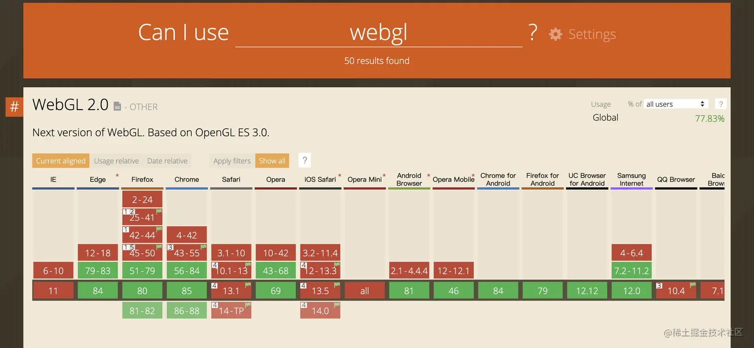 - webgl (web图形库),是根据 OpenGL ES 2.0来实现的一套 JavaScriptAPI,可以在浏览器中渲染交互式3D和2D图形。该API可以在