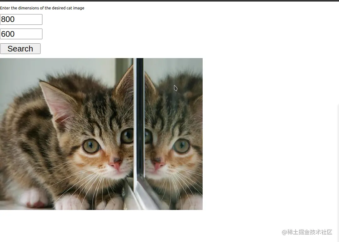 我们将通过一个小表单的简单实现,用户可以在表单中插入自己想要的随机猫咪图片的宽度和高度,然后通过我们的代码查询PlaceKitten的API来接收它