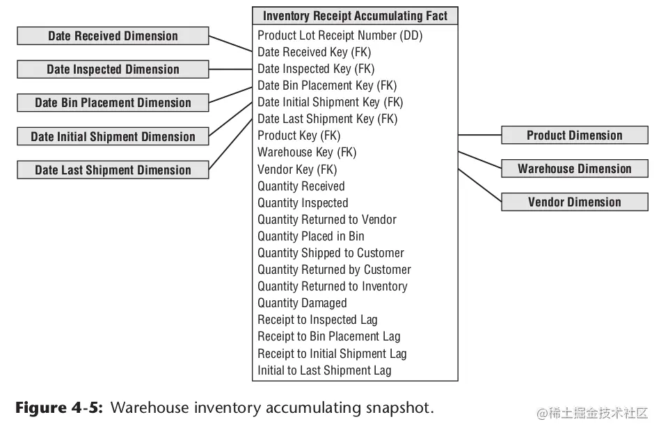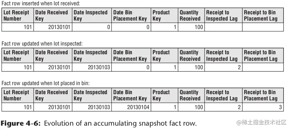 有些业务实体,会发生一系列的业务流程变更,在事实表中,使用一条记录,记录该业务实体各关键流程的所有信息,并随各业务事件的发生来更新这条记录,也就是一条记录会累计各种变化,叫做累计快照表。比如一个商品进入仓库的的整个流程可能有,收货,验货,装箱,运输等。其模型设计示例如下: