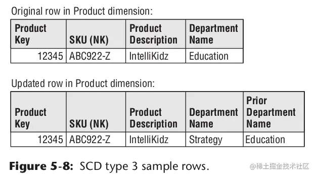 有的报表场景,可能就是需要根据新的维度信息,去关联老的的事实表记录,且变化不会太频繁。可以通过在维度表加字段,记录老数据,这样新老数据都存在,即可满足这种需求。示例如下:
