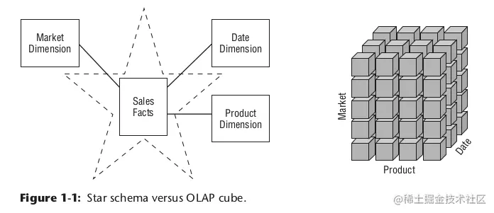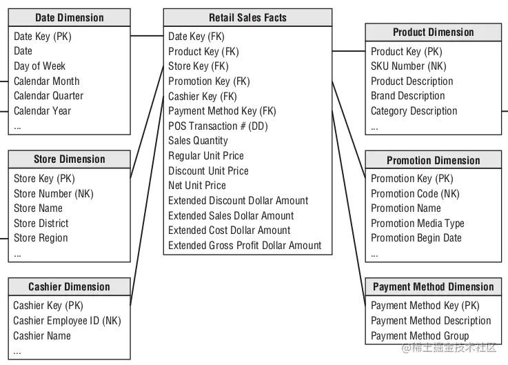 以一个业务事实为主表。比如一笔订单就是一个业务事实。订单有商品的SKU信息,销售市场信息,日期信息 ,这些基本属性,叫做维度。