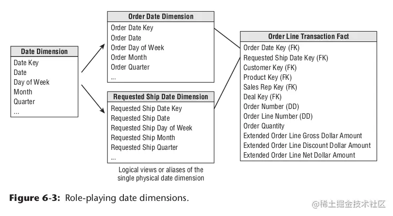 事实表中可能有多个字段,使用同一个维度表。那最后基于事实表做报表计算将会出现问题。因为不可能join同一张维度表两次。解决办法是基于公用维度表,建不同的维度表,让事实表关联这些新建的维度表,新建的维度表可以是实体表,也可以视图。假设一个事实表有多个字段关联时间维度表,按照这种处理方式的建模示例如下: