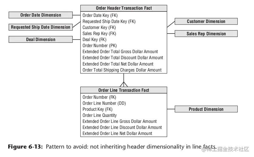 所以最好订单主表事实和明细表事实都做,再将其用主外键关联。同时为了性能考虑,一些不参与计算的订单属性,可以冗余到订单明细,如果只使用订单明细事实表时,不至于关联太多表。下面是一个坏案例,订单的主表的客户信息,没有冗余到明细表