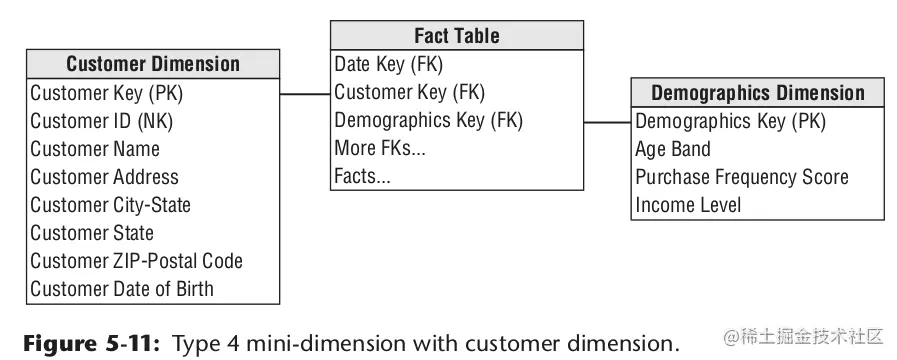 迷你维度记录了那些变化频繁的属性值所有可能的组合。事实表关联迷你维度表,即可覆盖每一种变化需求。由于迷你维度表,使用了范围值。所以如果想要获取某个具体属性值是不可能的。所以针对这种变化频繁,数据量大的业务数据,可以想办法做成事实表,而不是维度表。