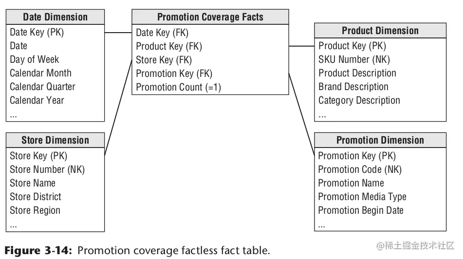 但这种方式的数据模型,但该事实模型无法回答哪一个促销商品在指定日期没有被购买的记录。因为没有被购买,就没有零售记录发生,数据库中根本就没有信息,也就无从统计。这个时候,我们可以增加另外一个事实表,只记录每天参与促销商品的信息。同时再建一个促销维度表,去描述具体的促销信息。模型设计如下: