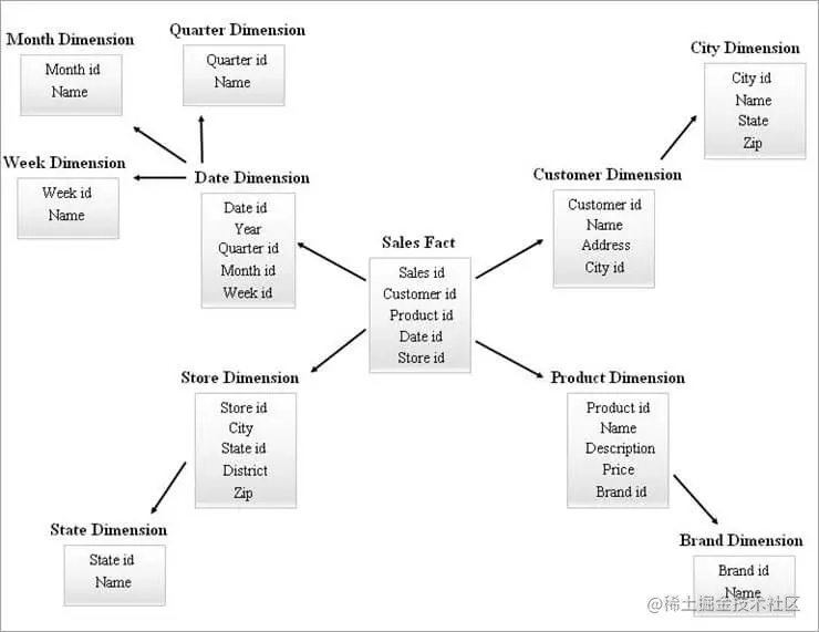 一个产品维度,本身还有分类、包装等信息,也独立做成表,围绕在事实表身边,就像一片雪花。