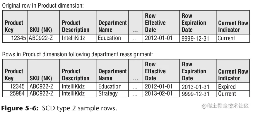 给维度表加上数据有效时间字段,将维度表变成拉链表,使得维度表不光能体现当前的值,还能记录历史的信息。示例如下: