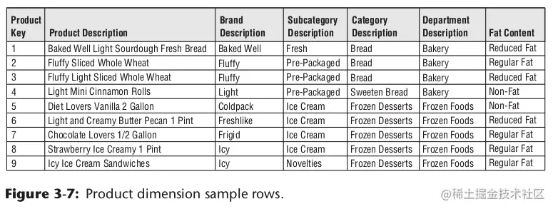 有些维度信息,本身是多层级,比如产品术语某个品牌,某个品牌属于某个分类。他们都是多对一的关系。我们建一张产品表,不应该也按事务型数据库中的范式来建多张表,而是应该打平层级。方便查询,提高性能,因为维度表数据量一般都很小,不用担心冗余情况。比如一个产品维度表示例如下: