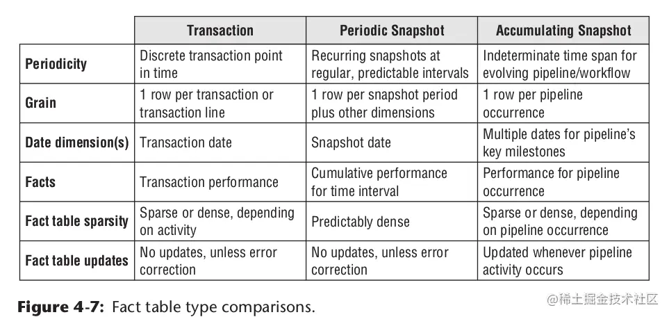 事实表中的字段,除了存放普通维度表主键外,还可以存放退化维度主键。比如事实表中有一个productId资源,对应的维度表为product表。而事实表中的一条记录对应的业务事件,其在关系型数据库中的的id,或者发票编号等,对报表后续计算依然是有意义的。这种字段我们依然会存放到事实表中,作为一个维度,但它不像产品id一样,有一个标准的维度表,我们称这种情叫退化维度。