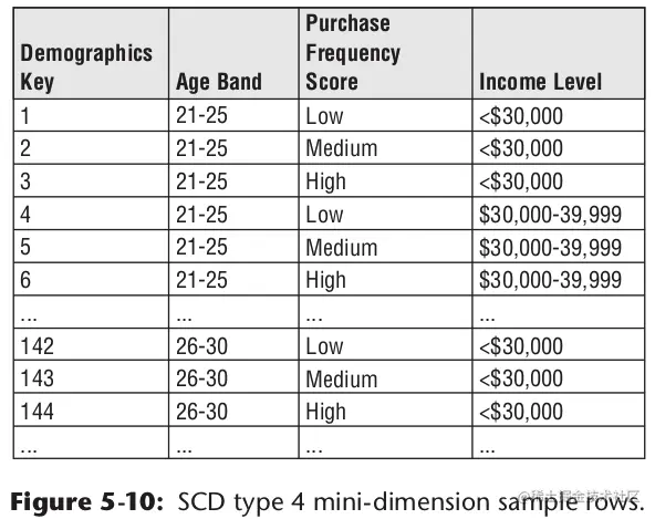 有些维度表的数据字段较多,且部分字段数据变更较为频繁,如果采用拉链表的方式设计,那维度表的数据,将会快速增加。所以拉链表不是一个好的设计。比如用户信息中,籍贯、民族等信息变化较少。但用户的收入等级、位置范围却会频繁的变化。所以可以将这些变化项抽出来,做成一个迷你维度表。同时为了减少迷你维度表的数据条数。可以使用范围做字段值,比如一张可能的用户迷你维度表表示例如下: