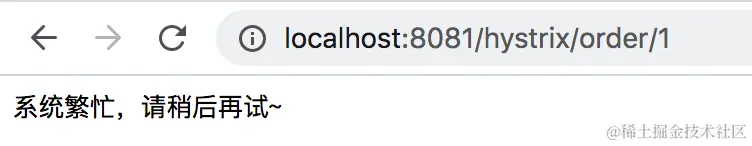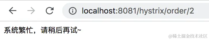 然后不断的刷新http://localhost:8081/hystrix/order/1,然后发现请求http://localhost:8081/hystrix/order/2 也出现了异常,如下: