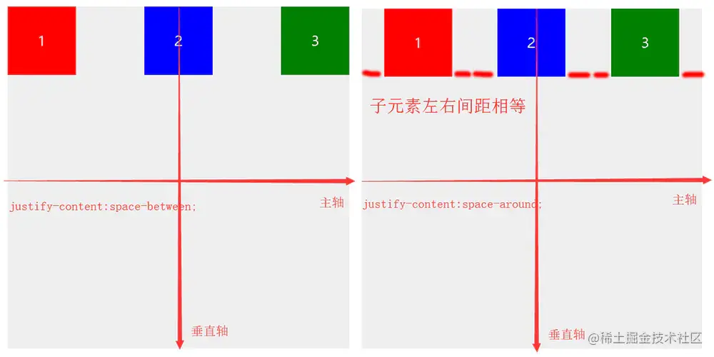 | space-around | 等间距对齐,两端留空,每个元素左间距与右间距大小相等 |