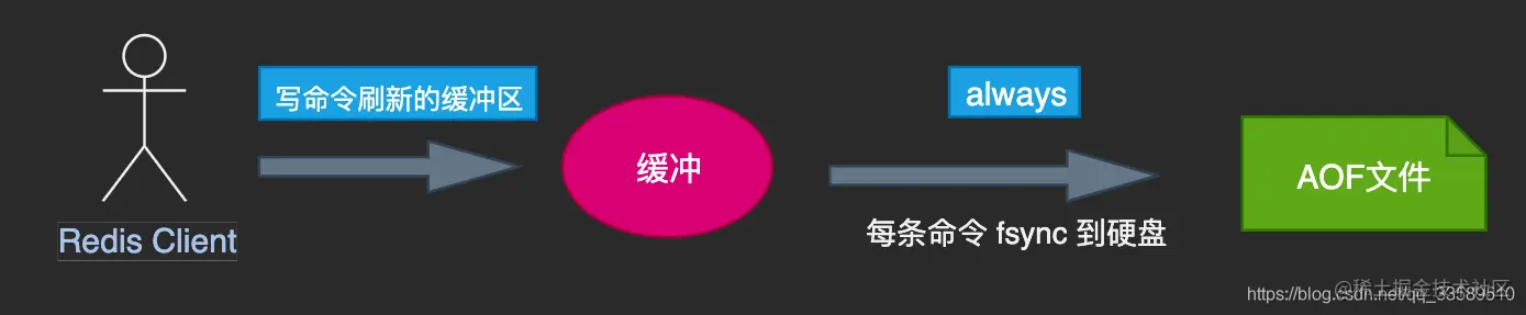 - 每次刷新缓冲区,都会同步触发同步操作。因为每次的写操作都会触发同步,所以该策略会降低Redis的吞吐量,但该 模式会拥有最高的容错能力。