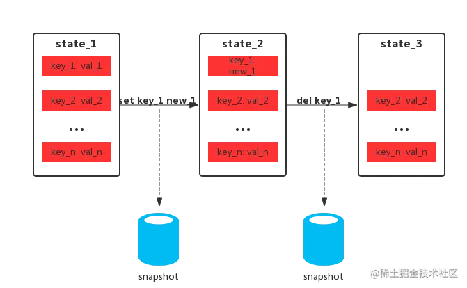 Redis Server在有多db 中存储的K.V可理解为Redis的一个状态。当发生写操作时,Redis就会从一个状态切换到另外一个状态。