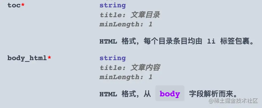 toc = serializers.CharField(label="文章目录", help_text="HTML 格式,每个目录条目均由 li 标签包裹。")