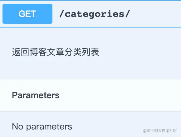 CategoryViewSet 视图集就一个接口,对应的 action 是 list,因此 docstring 的格式就像上面那样,文档中的效果如下:
