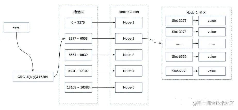 Redis Cluster 采用虚拟哈希槽分区,所有的键根据哈希函数映射到 0 ~ 16383 整数槽内,计算公式:HASH_SLOT = CRC16(key) % 16384。每一个节点负责维护一部分槽以及槽所映射的键值数据。