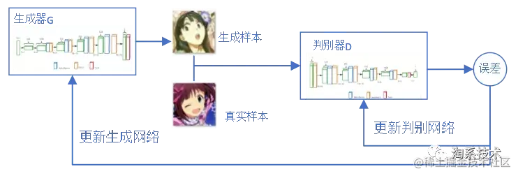GAN的博弈过程,就是使用生成器制造的数据分布来拟合真实的数据分布。设置是一个生成动漫图片的网络,接收一个随机的噪声,生成动漫图片并输出。设置为判别网络,输入一张动漫图片,判别器可以计算出该图为生成的或真实图片的概率。两者分别根据返回的结果反向更新网络,相互抗衡,动态变化最后达到纳什均衡。