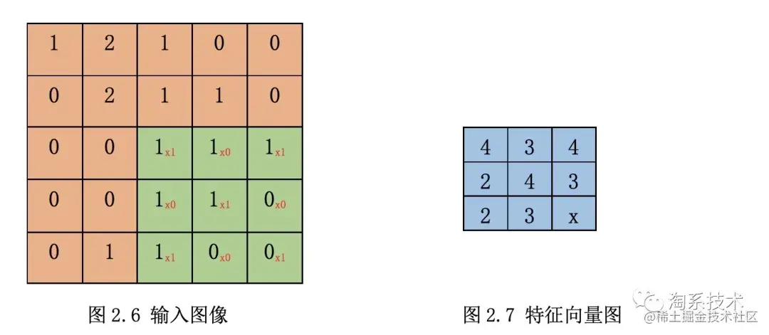 下图2.6是一张大小的原始图片,设置经过卷积操作后,得到一张大小的特征图像的部分过程,图2.6为原始输入图像,绿色部分为卷积核,蓝色图像为目标图像,为卷积后图像长度,图2.7中的值可以通过绿色部分的运算。
