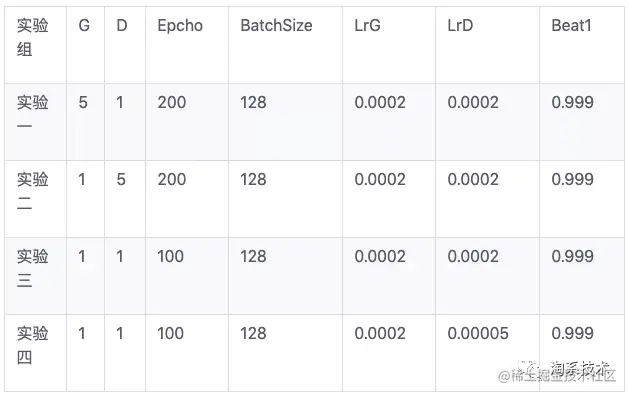 为了证明各参数设置对网络训练效果的影响,在不同的对照组中按照比例设置参数。其中,G代表生成器在单位周期的训练次数,D代表判别器单位周期的训练次数,LrG表示生成器学习率,LrD表示判别器学习率,Epcho表示总训练周期,BatchSize为一次迭代时输入的样本数量,经过多次实验与测试,选取了以下4组具有代表性的实验参数用于实验结果分析,如下表4.2所示: