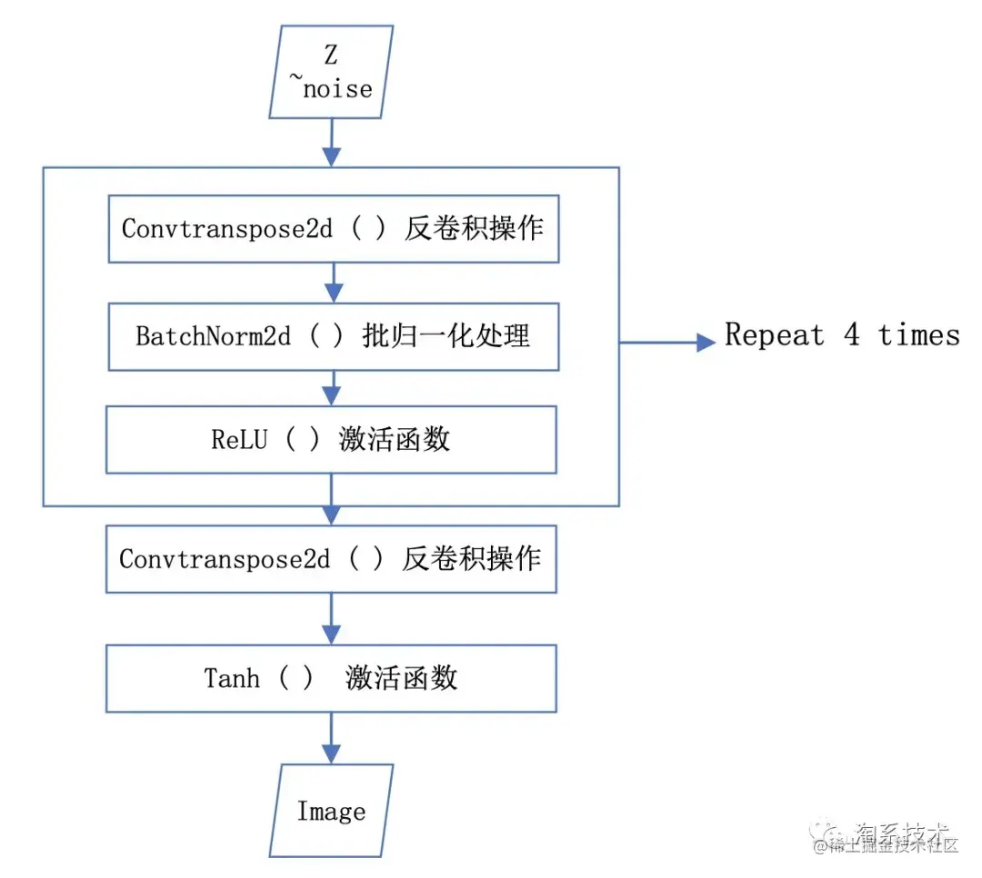 生成器整个网络结构没有池化层,输入一个服从均匀分布的nz维度的噪声,神经网络根据输入的向量信息,分步获取输入图像的特征信息,例如:线条、风格等,随后根据网络的深度,不断优化图片的细节。