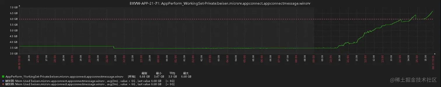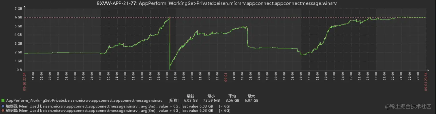 突然间接到运维的报警,我们一个服务,内存找过了6GB的占用。才6GB 也不是很大,因为在处理别的事情,服务dump一下暂时一放,然后半小时之后,接到了运维的Kafka堆积报警。然后切换着重启了一下两个节点,Kafka消费速率回复正常,内存也从500M攀升到2GB后逐渐稳定。当天半夜,运维又报警,不过已经熟睡的我,并没有第一时间响应,第二天观察了一下服务,发现内存已经回归到了2GB左右。