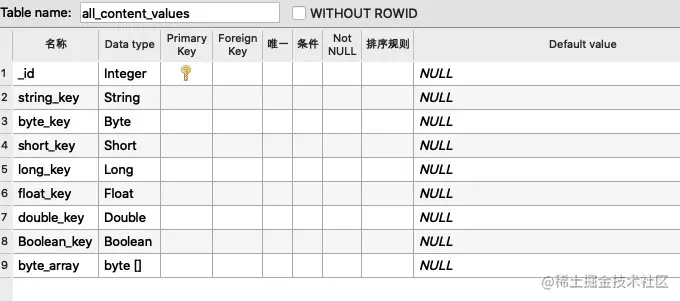 创建时候设定的字段: _id,string_key,byte_key,short_key,long_key,float_key,double_key,Boolean_key,byte_array.这么一对比,好像没有少字段,而且表好像还创建成功了,emmmm? 那么我创建表的时候是不是可以直接用存了啊,不用把string 写成 varchar 了。通过 sqlitestudio 也可以直接查看表结构