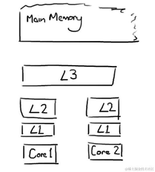 一个程序执行后,会在内存中开辟一块内存空间,cpu会去读取内存中的指令,但是cpu的速度是内存的100倍,因此厂商在优化cpu上做了很多尝试,比如指令重排序,增加缓存等。我们先讲缓存部分。