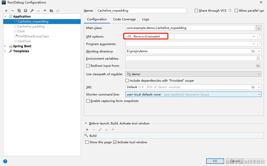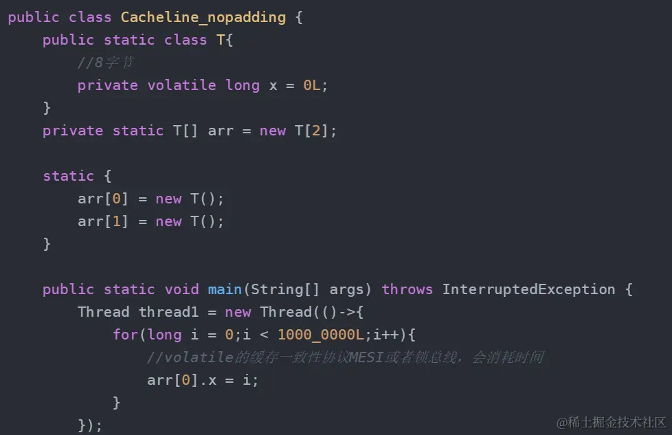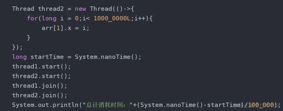 因为一个缓存行是64字节,我们这里设置x 为8字节,启动两个线程,这时候产生了伪共享。而在x 前加上7个long,则补齐了64个字节,就不产生伪共享了。
