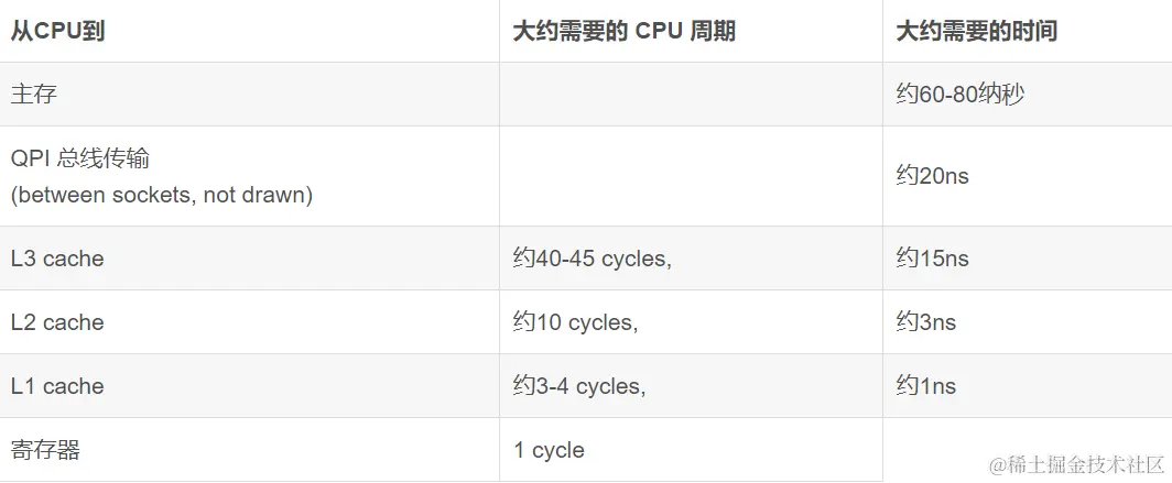 经过不断的工业尝试,现在主流是三级缓存架构。他们之间的时间差异如下图