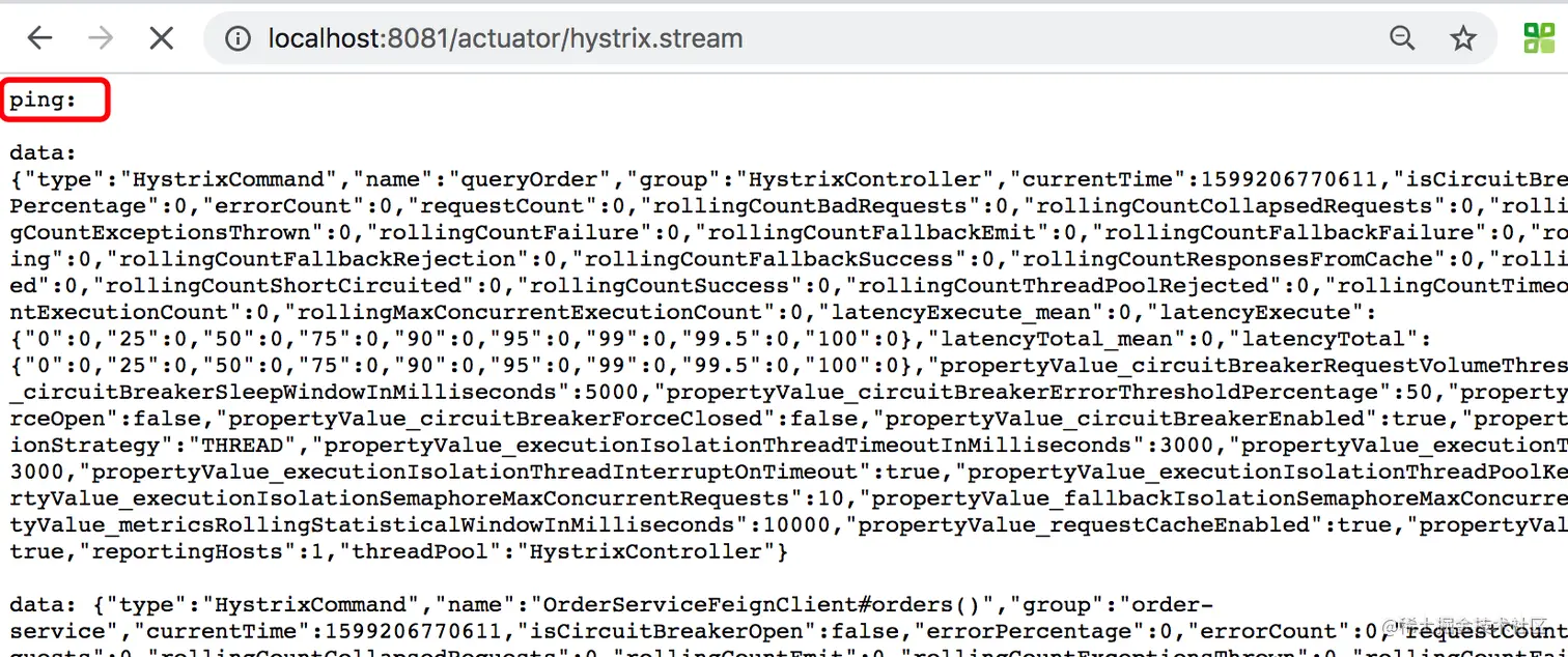 这个请求会不断地发出ping,然后把链接放在hystrixDashboard面板中进行采集数据进而展示。