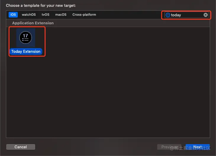widget的创建很简单,Xcode->File->New->Target->Today Extension如下图所示: