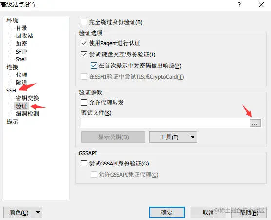 高级,然后选择SSH → 验证 → 密钥文件